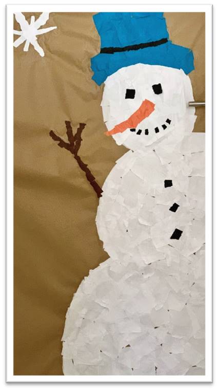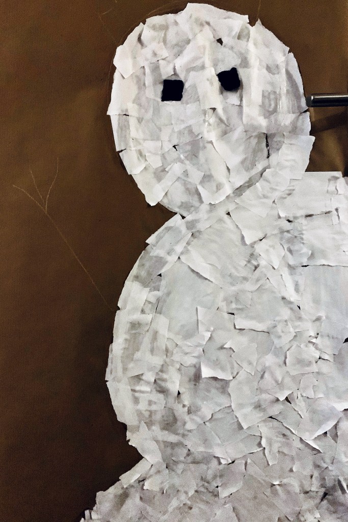 Als Ort für unseren Schneemann haben wir die Kinderzimmertür gewählt, und braunes Packpapier drauf geklebt. Die Form des weißen Kerls habe ich mit Kreide vorgezeichnet. Dann ging es los: Wir mussten viel weißes Papier zerreißen und aufkleben.