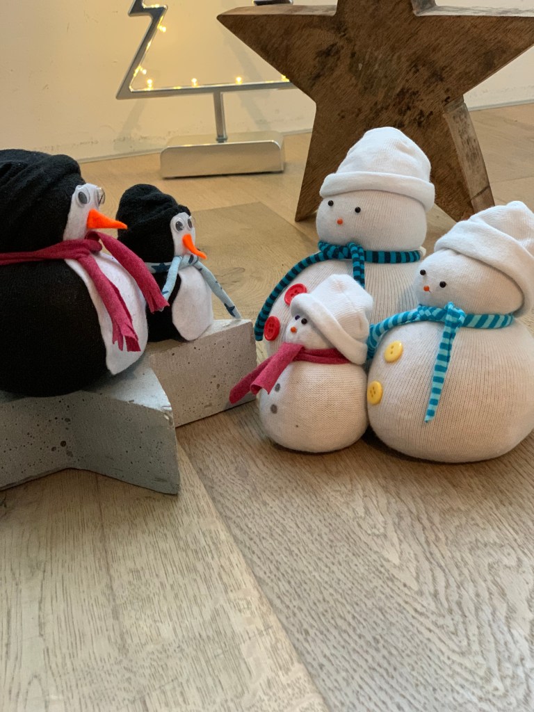 Die Socken-Pinguine sind so ziemlich ohne Beteiligung der Kinder entstanden. Gemacht werden sie gleich wie die Sockenschneemänner. Eine gute Anleitung gibt es hier: https://pin.it/ipbsqpda75cat4