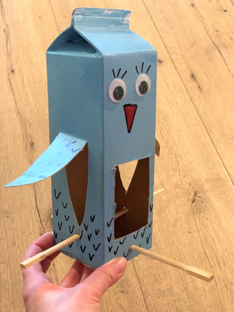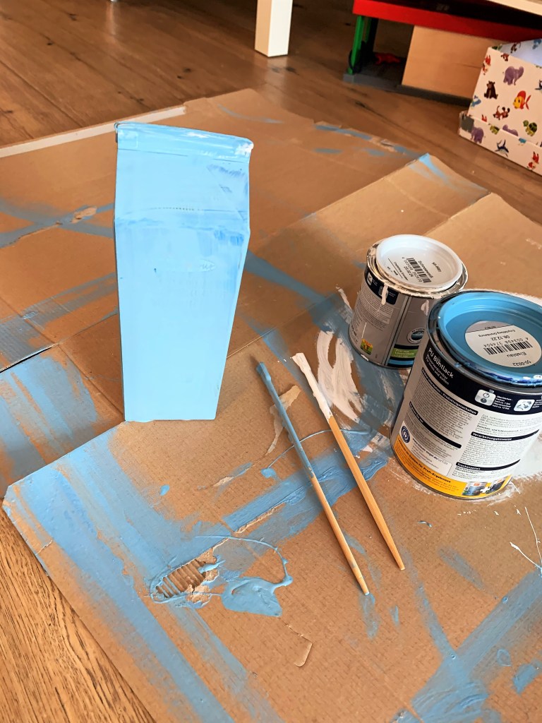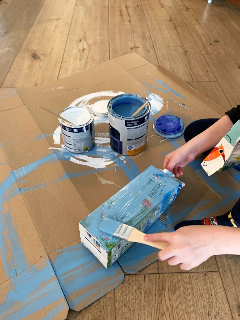 Nach Ideensuche auf Pinterest haben wir eine leere Milchpackung verwendet und daraus ein kleines Vogelfutterhaus gebastelt. Der große Pirat durfte beim Lackieren helfen. Gut dass wir noch so viel Farbe vom Piratenbett übrig hatten. Schade dass die Vögel in unserem Garten den Inhalt dieses blauen Freundes noch nicht entdeckt haben…