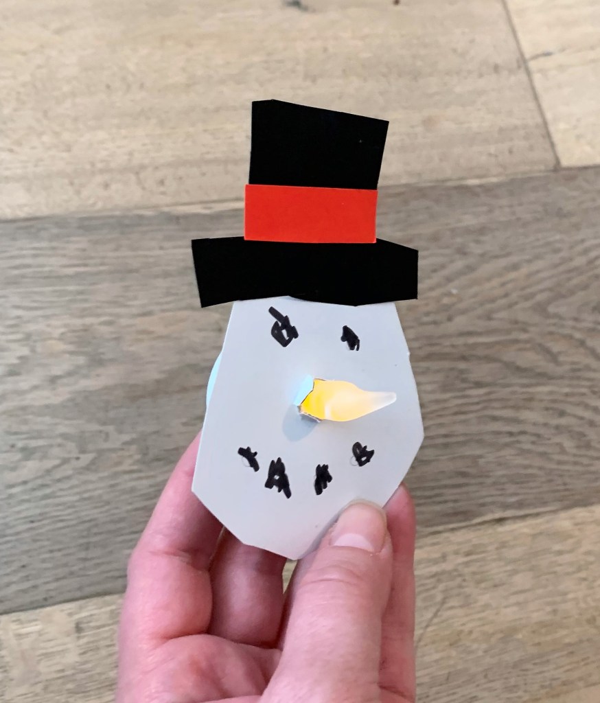 Der Minischneemann aus einer LED Lampe ist echt schnell gemacht und schaut total süß aus! Ich habe weißen Karton als Kopf genommen, weil ich nicht die Lampe selber anmalen wollte, das geht aber auch. Dann braucht man überhaupt nur den Hut dazu basteln.