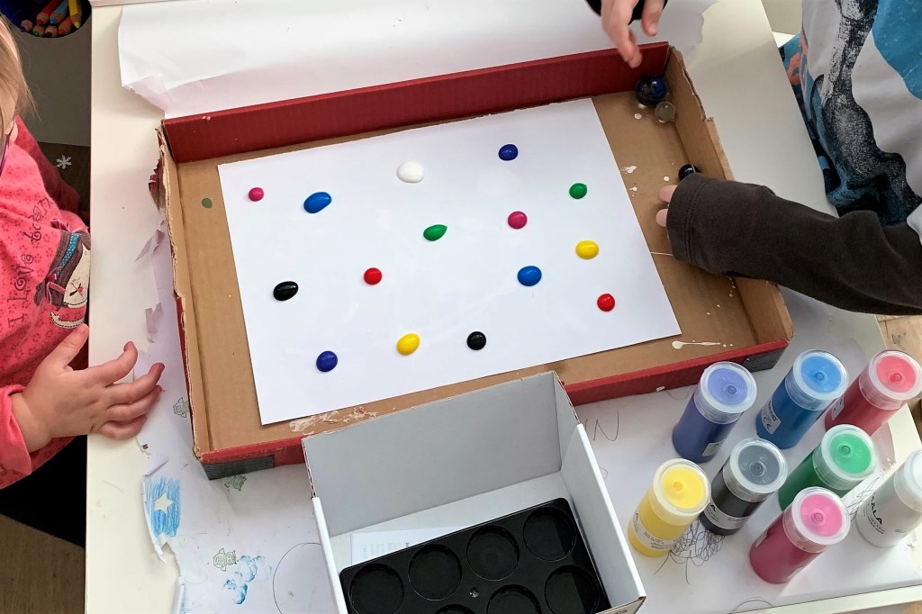 Für die Murmelbilder braucht man nicht viel vorzubereiten. Man benötigt den Deckel eines (Schuh)kartons, Papier, Flaschenfarbe und natürlich Glasmurmeln (wir haben 6 Stück verwendet).