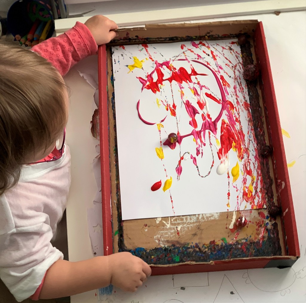 Jetzt muss nur der Kartondeckel vorsichtig bewegt werden, damit die Murmeln ins Rollen kommen. Der große Pirat ist ja auch ein ausgesprochener Kugelbahn- und Murmelfan! Also das absolut richtige Projekt für uns. Und sogar auch für die kleine Schwester, denn bei diesen Bildern durfte sogar sie mithelfen.