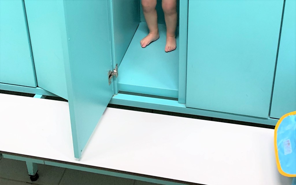 Nach einer ausgiebigen Dusche für die Kinder sind wir schließlich wieder im Umkleideraum und es gilt zwei Flöhe und mich selbst mit gefühlten dreitausend Kleidungsstücken wieder anzuziehen. Vielleicht hätte ich das Gewandt vorhin doch nicht so reinstopfen sollen, denn jetzt muss ich erst mal wieder alles gleichdrehen und zusammensuchen. In der Zwischenzeit sind beide Kinder in Spindkästen geklettert und spielen Kuckuck.