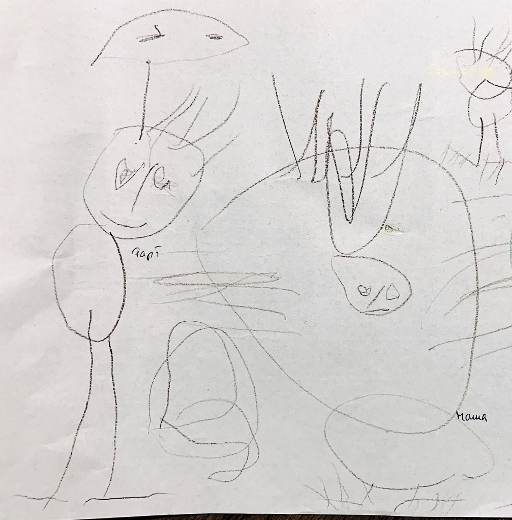 Auf jeden Fall bin ich stolz auf meinen Sohn weil er erstmals unsere Familie gezeichnet hat. Bis jetzt war das Zeichnen ja so gar nicht seine Sache. Und man kann es ja auch so sehen: Ich bin definitiv der (große) Mittelpunkt der Familie 😉 ;-)!
