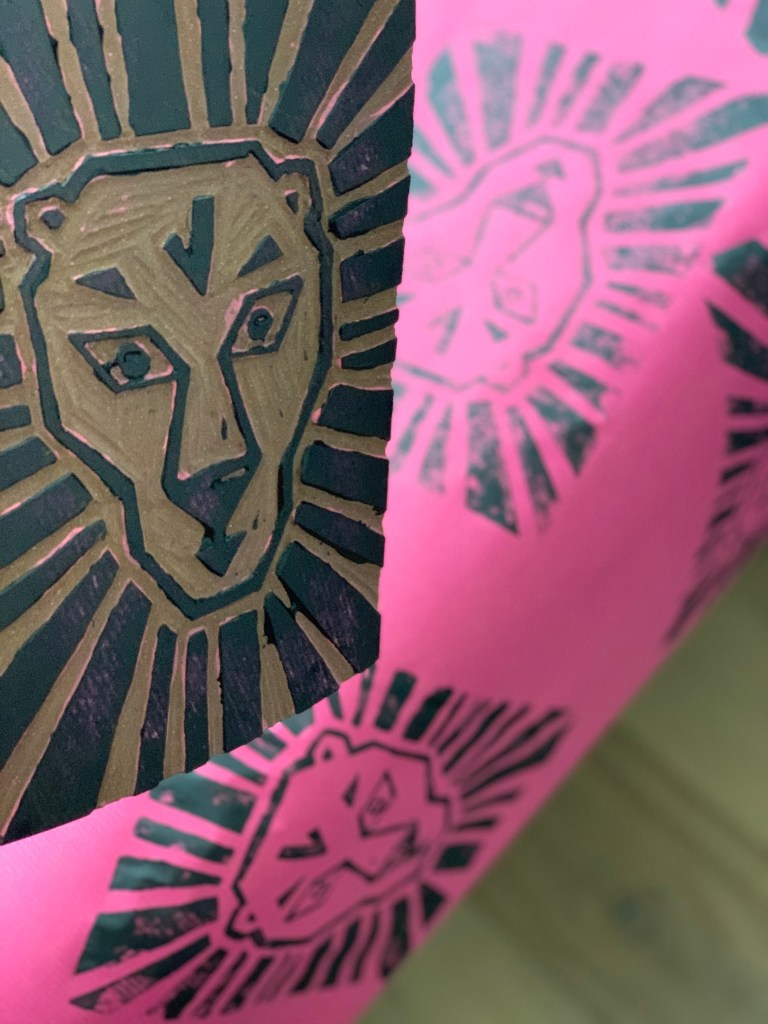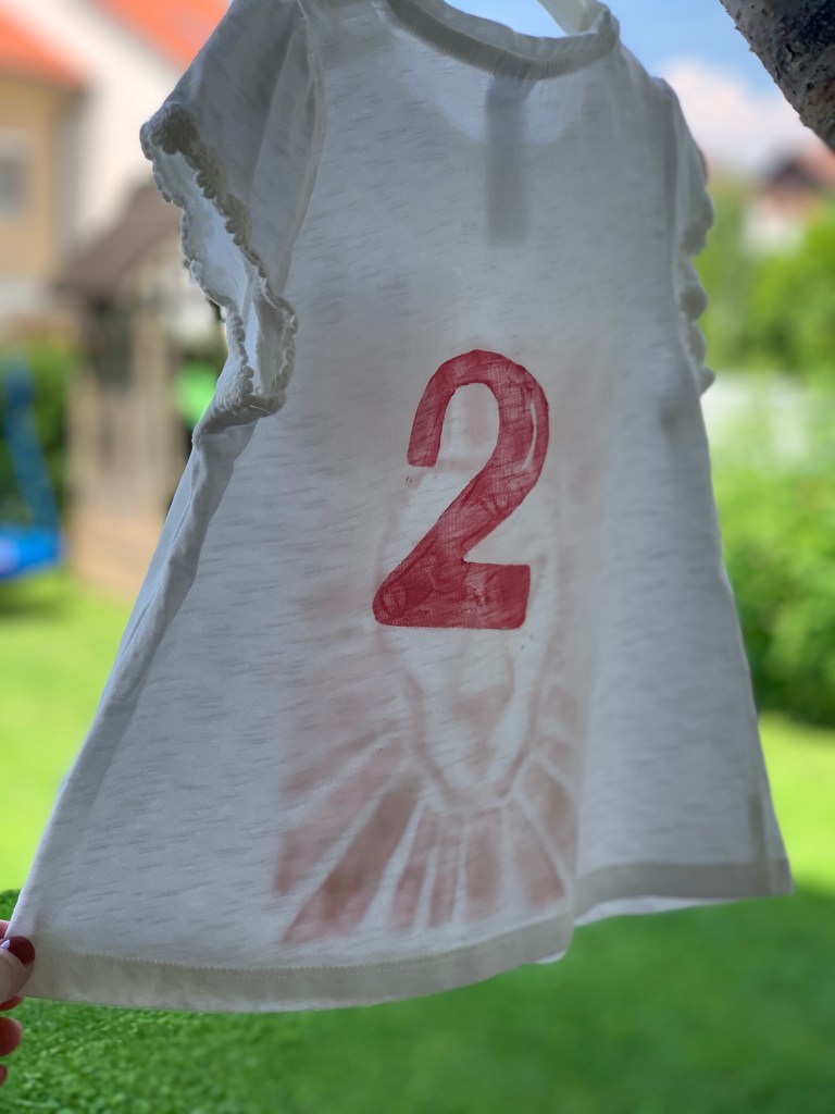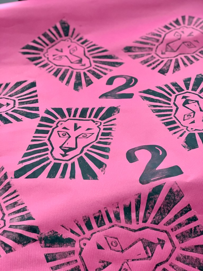 Von mir bekam die kleine Süße (unter anderem) ein weißes T-Shirt, das ich vorne mit einem pinken Löwen und hinten mit einer „2“ bedruckt habe. Auch auf Stoff lässt sich mit Linoldruckplatten gut abdrucken, finde ich!