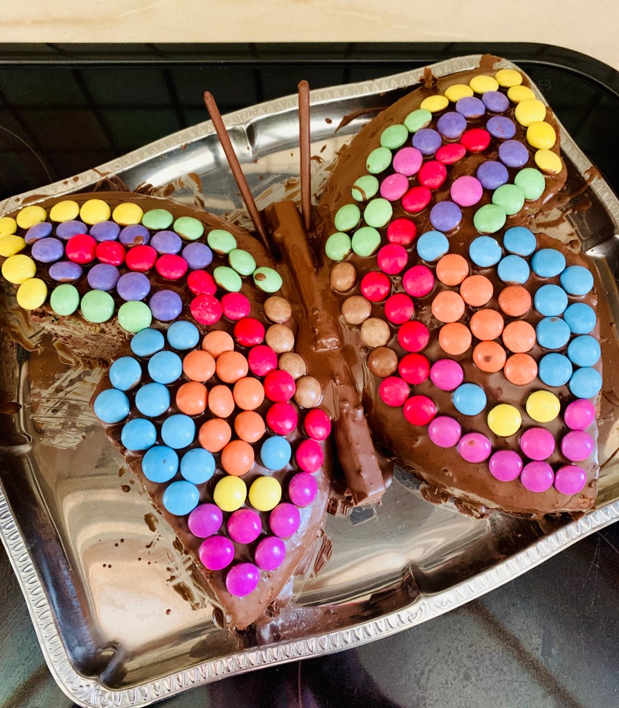 Am Nachmittag gab`s eine tolle, kunterbunte Schmetterlingstorte mit Smarties! Sogar den Teig hab ich mit Lebensmittelfarbe eingefärbt :-)!
