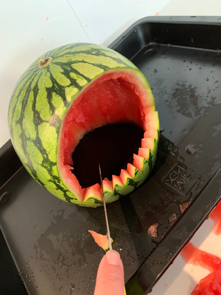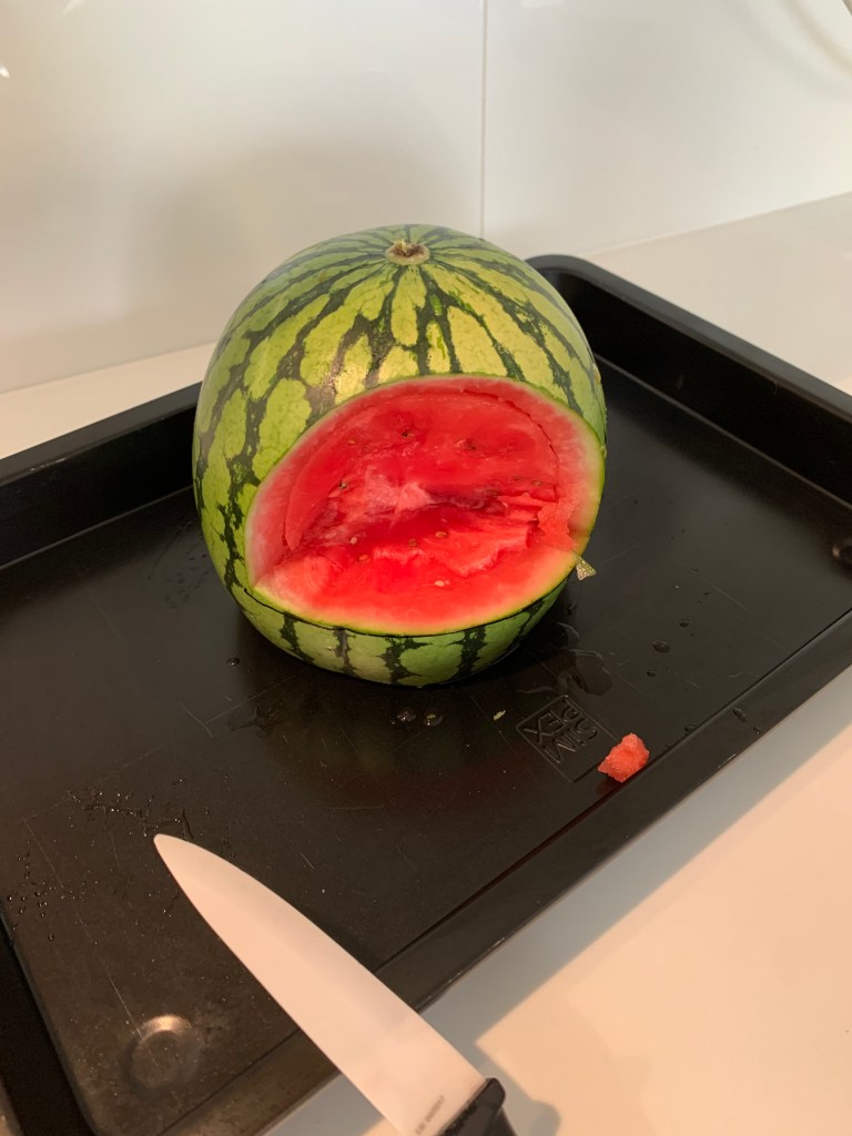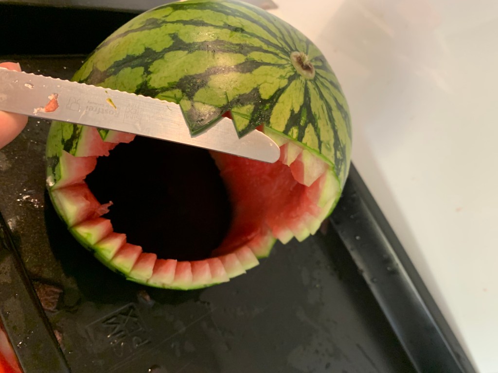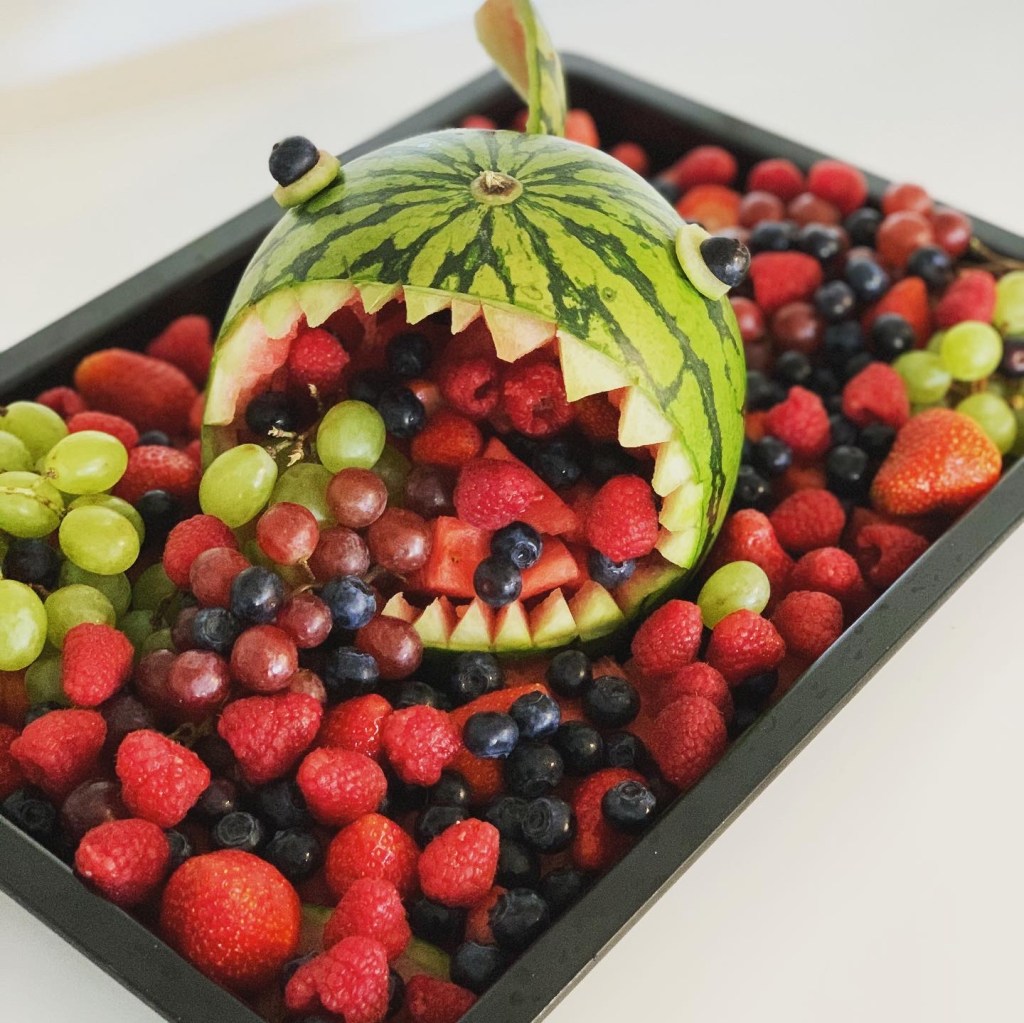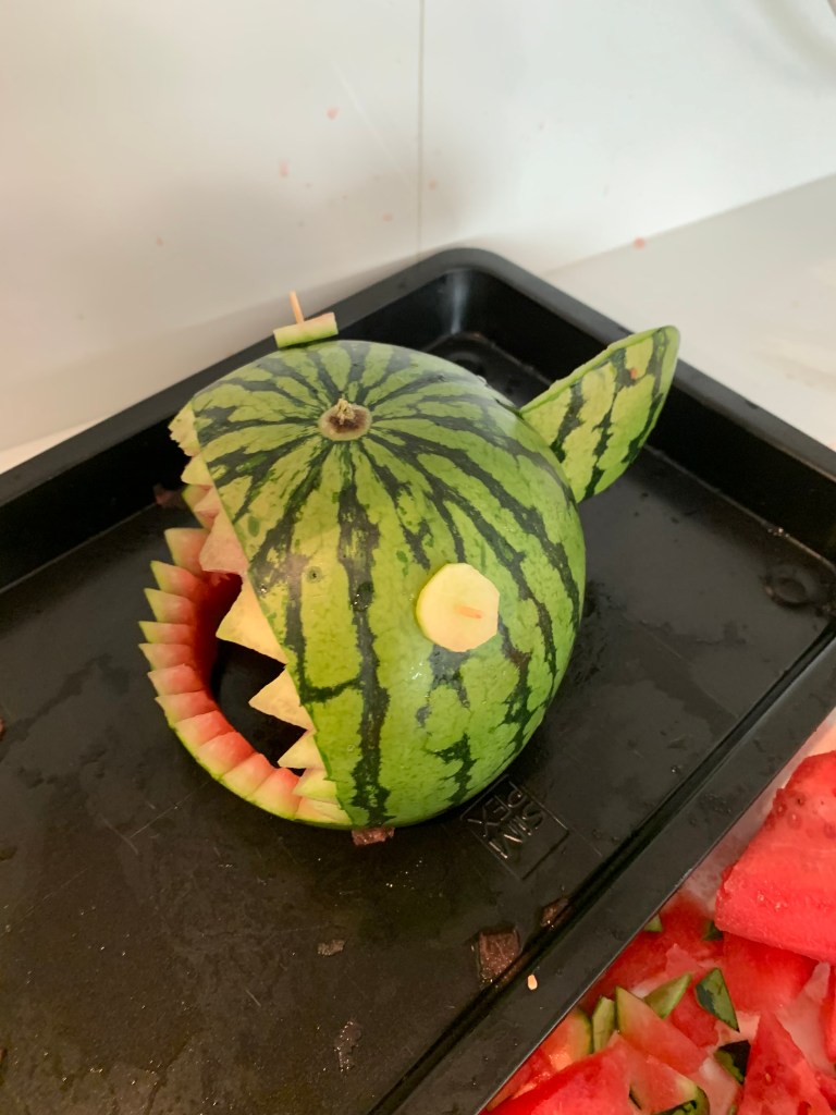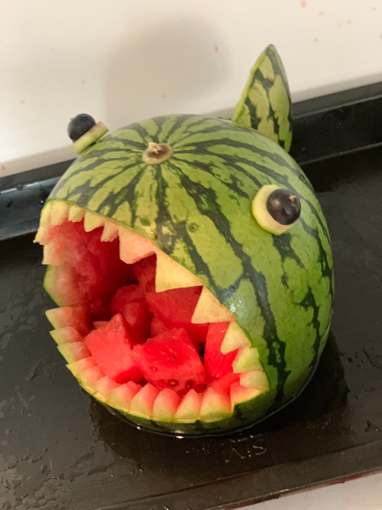 Für die vorgezogene Feier im Kindergarten eine Woche vor dem eigentlichen Geburtstag (weil Ferien) gab es, wie auch schon letztes Jahr, einen Melonenhai mit Früchten. Am Vorabend vorbereitet und dann in der Früh frisch befüllt.