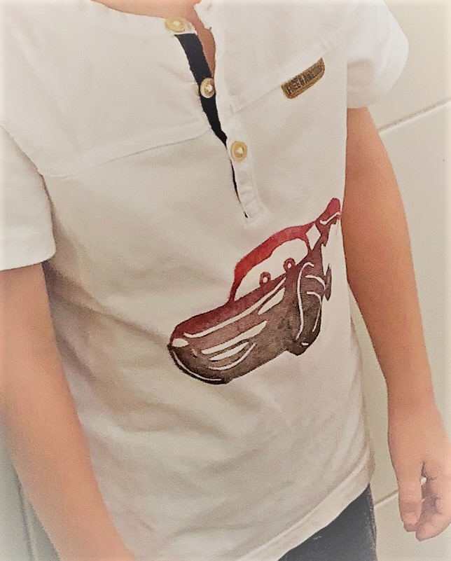 Natürlich gabs auch für den großen Piraten ein Geburtstagsshirt, selbst bedruckt mit seinem Lieblingsauto aus dem Fernsehen und der 5 auf dem Rücken.