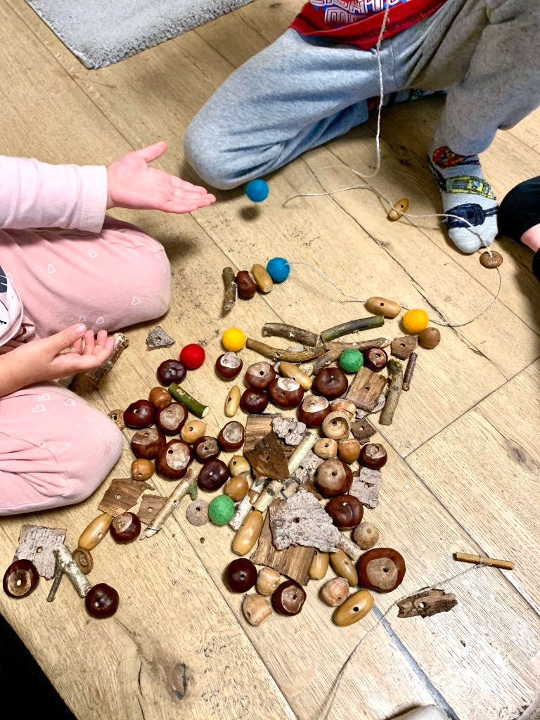 Dafür kann man so ziemlich alles verwenden, das sich durchbohren lässt. Mit bunten Filzkugeln haben wir Farbakzente gesetzt. 🙂