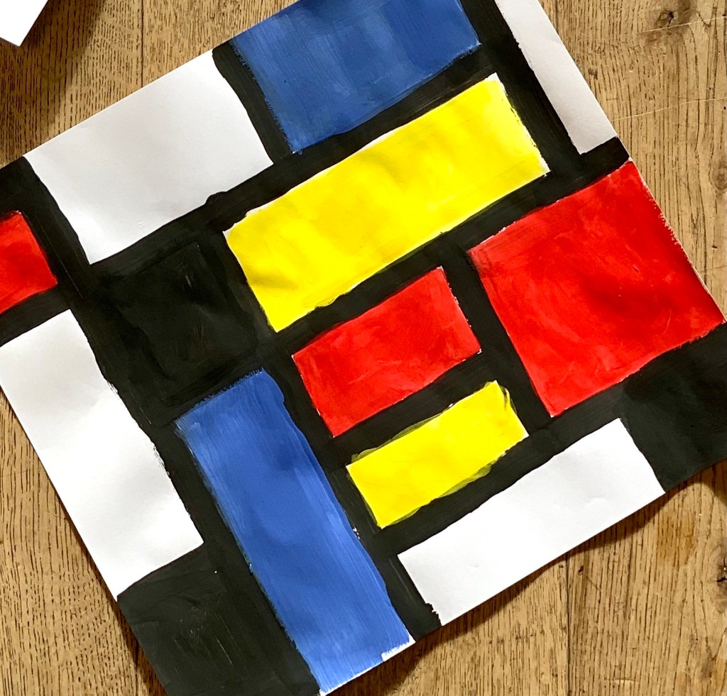 Wer kein schwarzes Klebeband zur Hand hat, malt erstmal die schwarzen Linien auf und lässt sie kurz trocknen, bevor die Felder bunt bemalt werden.