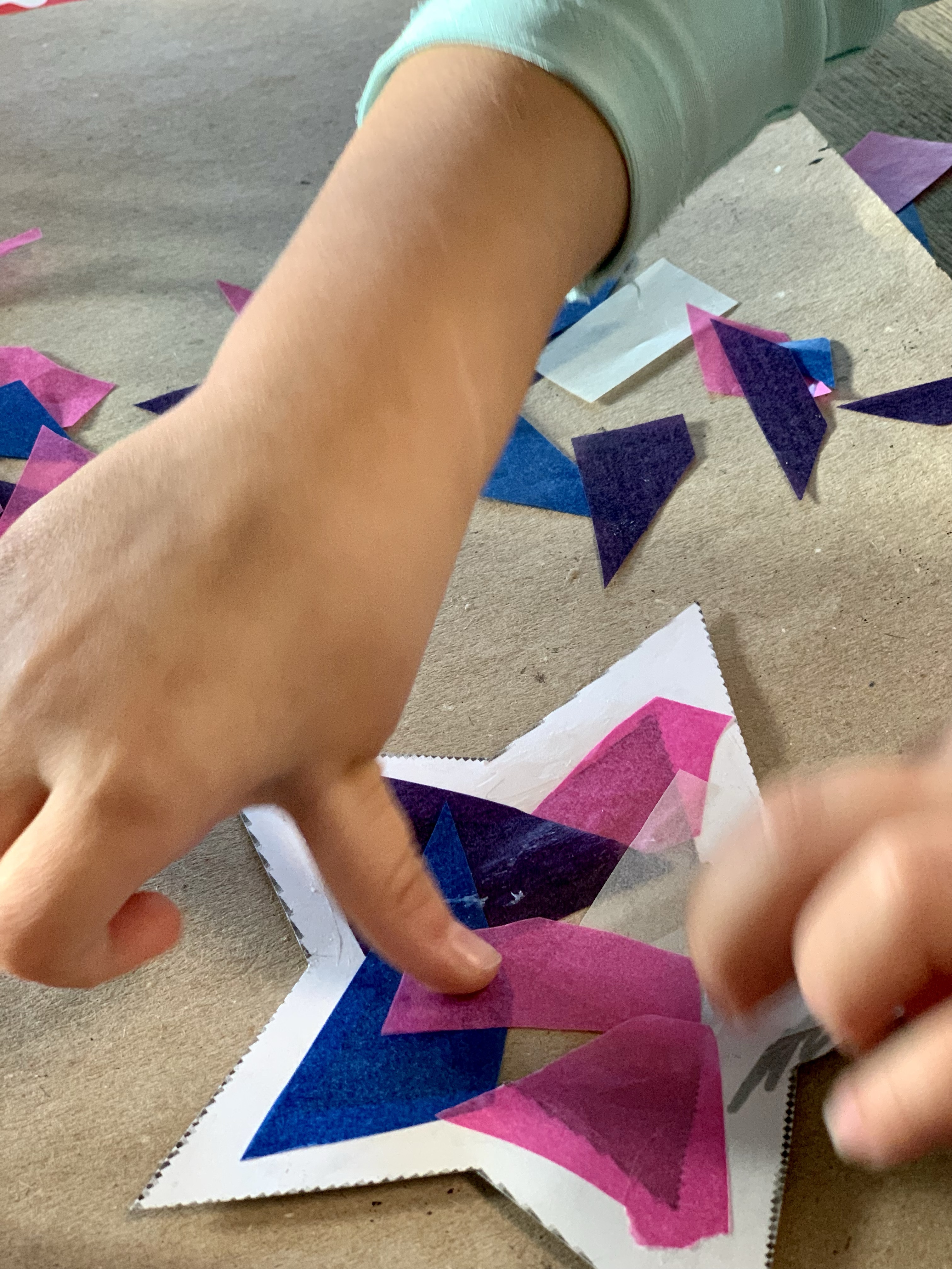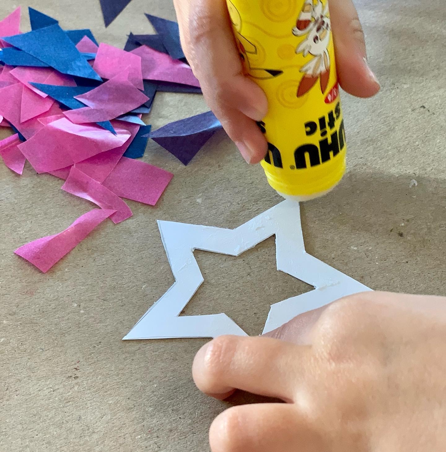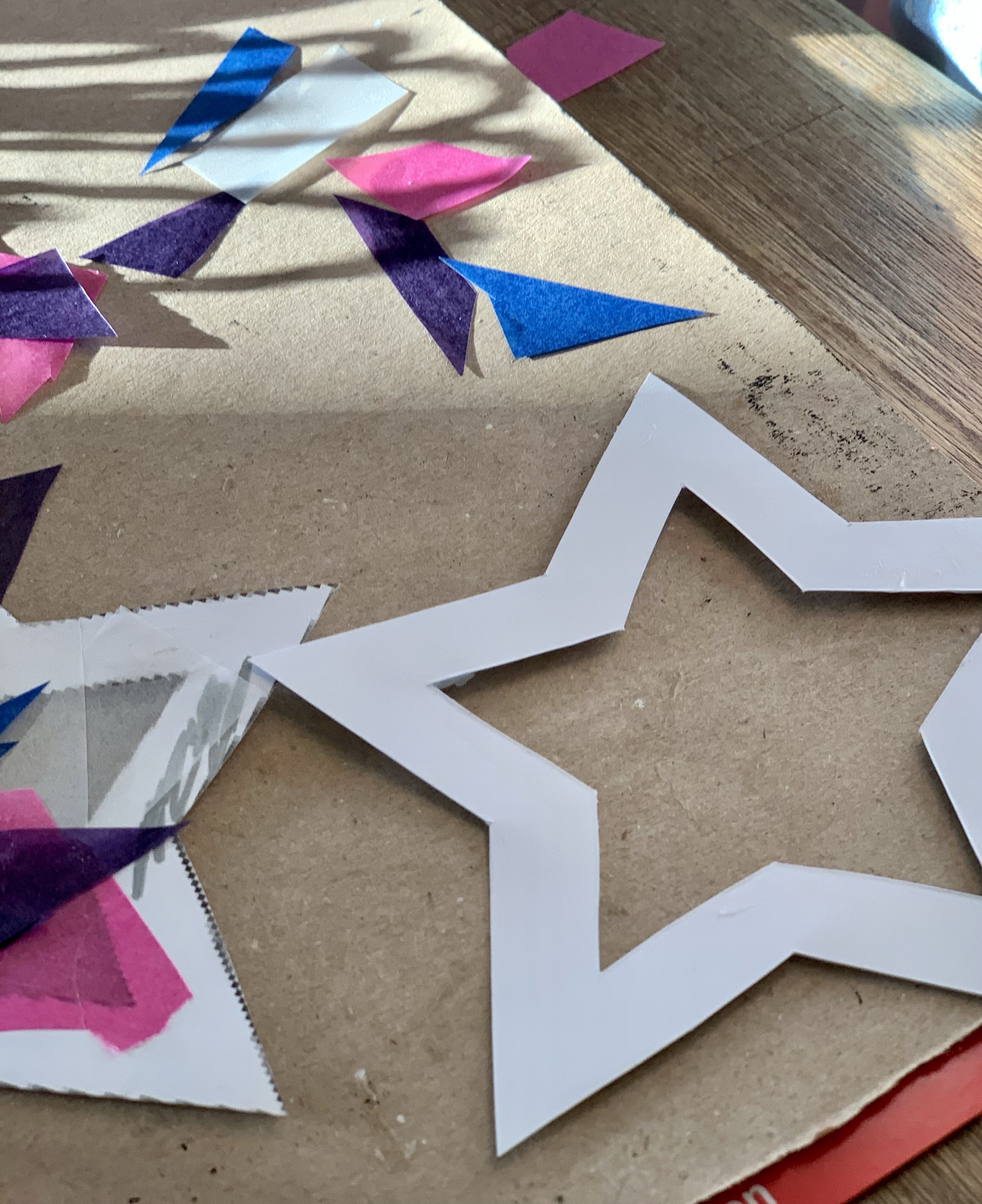 Der Leerraum wird dann mit Schnipseln aus Transparentpapier in den Wunschfarben beklebt, bis alles bedeckt ist. Dann klebt ihr den zweiten Rahmen in derselben Größe auf – fertig!