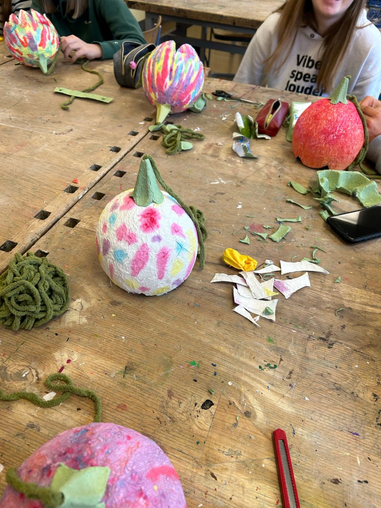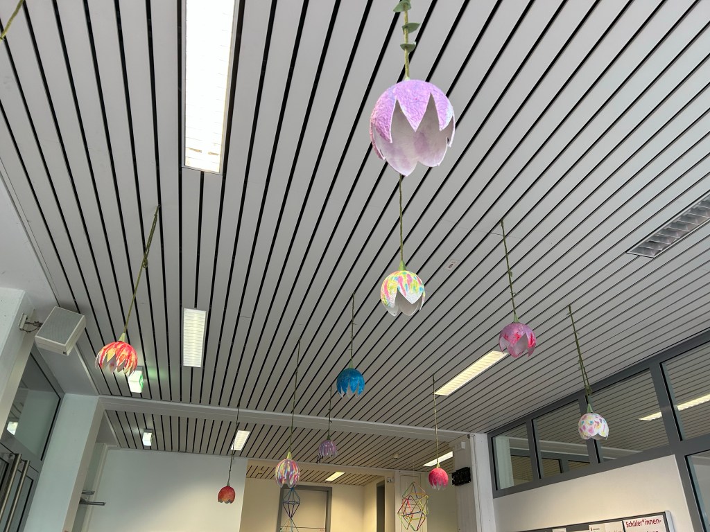 Hier seht ihr die Ergebnisse aus meinem Unterricht an der BAfEP. Meine Schülerinnen hatten Spaß an dieser Arbeit, die sie später gut in der Praxis im Kindergarten umsetzen können. Der große Vorteil an der unkonventionellen Herstellung der Kugel/Blüte ist, dass sie komplett ohne Klebstoff und Sauerei mit Kleister auskommt. Die Handhabung einer Sprühflasche braucht anfangs vielleicht noch die Hilfe der Pädagogin/des Pädagogen ist aber jedenfalls dem Eintauchen der Papierblätter in eine Wasserschüssel vorzuziehen. Bei letzterem kommt es leicht zu einer mittelschweren Überschwemmung und das Papier klappt auch leichter zusammen und lässt sich schwer auf den Luftballon aufbringen.