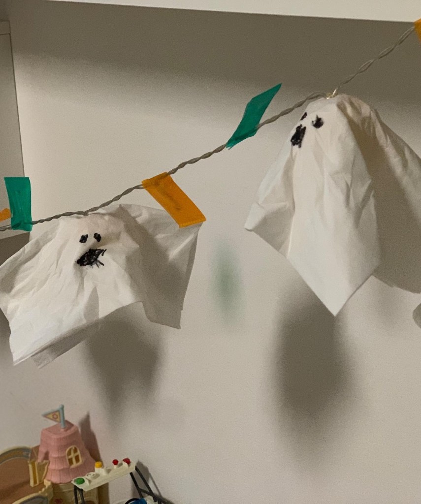 Super einfache Deko Idee für Halloween aus Ü-Eiern, Taschentüchern und Lichterkette.