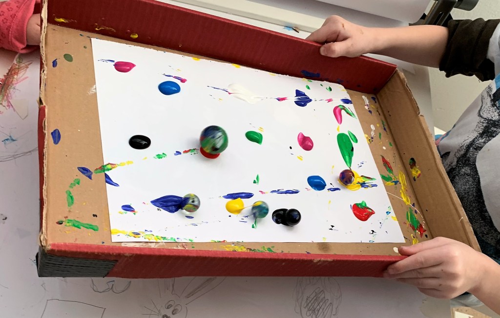 - Murmeln rein! Es empfiehlt sich, eine große Glasmurmel und 3-4 kleine Murmeln zu wählen, da die kleinen relativ leicht in der Farbe stecken bleiben.