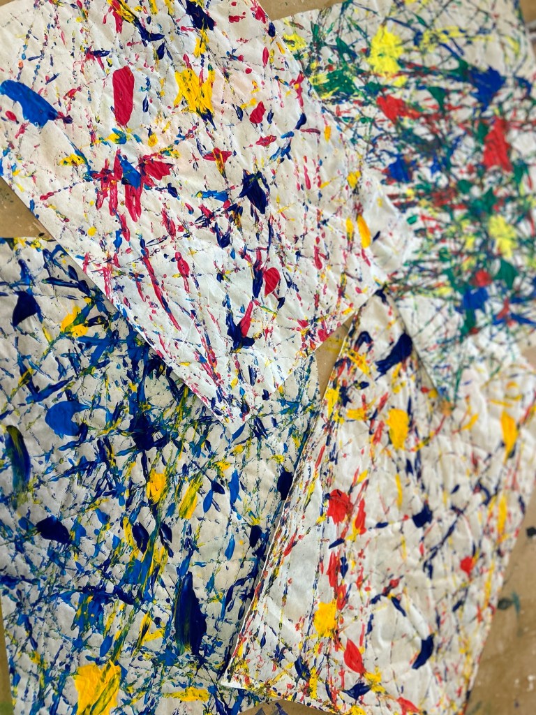 - Flaschenfarben auf das Papier. Es eignen sich Temperafarben, Gouache, Schulmalfarben etc. Idealerweise wählt das Kind seine Lieblingsfarben und darf diese direkt aus der Flasche in mehreren Kleksen auf das Papier drücken.